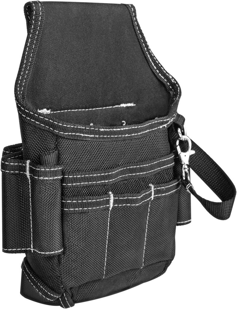 Small tool pouch for construction workers, carpenters, plumbers, electricians, and more Heavy duty polyester construction with ballistic stitching for rugged durability Clip attachment connects to any size belt up to 2-3/4 inches wide Five pockets and eight loops including large main pocket, smaller front pocket, tool sleeve, electrical tape strap, carabiner for keys, and more