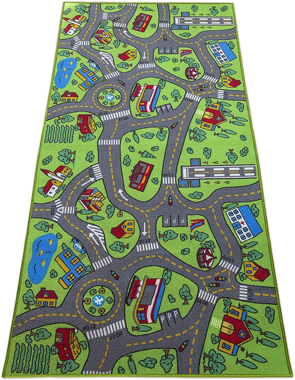 This rug has everything! Ponds, Runways, Parking, Houses, Trees and Roundabouts Non-slip Latex back keeps it safe for your kids! Enough room for a few kids to play at once, it measures 26” x 43.5” This will keep your kids busy for hours